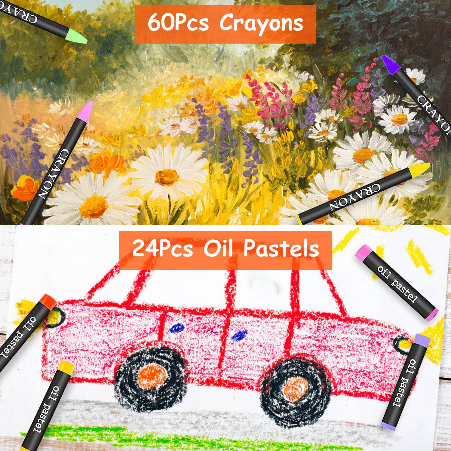 - *Professional Complete Art Supplies*: Our 140Pcs professional art supplies include:24x colored pencils,24x oil pastels,24x watercolor cakes,60x crayons,2x HB pencils,2x painting brushes,1x eraser,1x sharpener and 1x sponge. Open the elegant wooden box,you will be surprised to find out we’ve well organized everything you need in it,you can start creating your masterpiece.