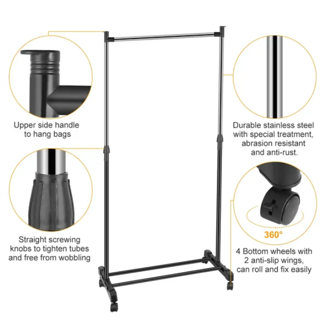 Adjustable & Foldable Rolling Garment Rack, Stainless Steel Clothes Hanger